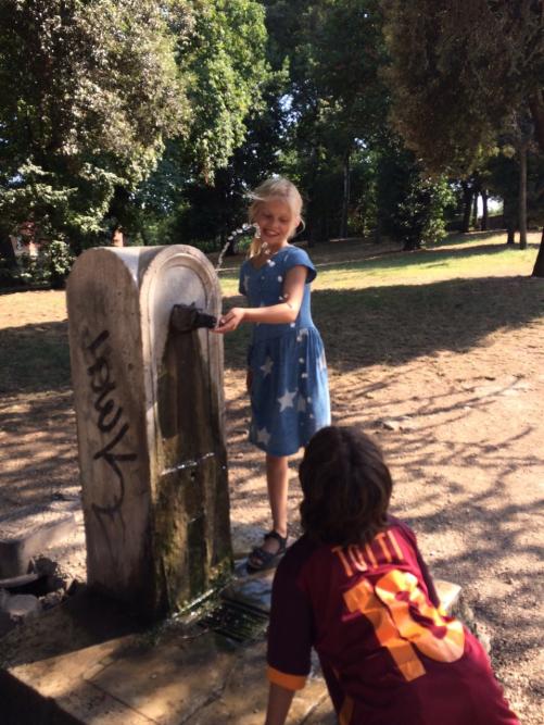 Die Fontane di Roma sind Brunnen, die an fast jeder Ecke stehen. Man erkennt sie an diesen Merkmalen: Auf ihnen steht: S.P.Q.R, manchmal sind die Wasserhähne der Kopf einer Wölfin. Und sie haben oben ein kleines Loch im Wasserhahn. Der Kopf der Wölfin bedeutet, dass Romulus und Remus von einer Wölfin aufgezogen wurden. Die Funktion des kleinen Loches ist die: man hält seinen Daumen oder seine Hand unter das große Loch und drückt, so kommt das Wasser aus dem kleinen Loch und man kann trinken. Unten trinken die Hunde. Die Brunnen helfen auch armen Menschen, die sich zum Beispiel kein Wasser leisten können. Das kalte, erfrischende Wasser hilft auch, wenn man Durst hat bei großer Hitze. Das Wasser ist immer schön kühl. Das Wasser kommt aus den Bergen.