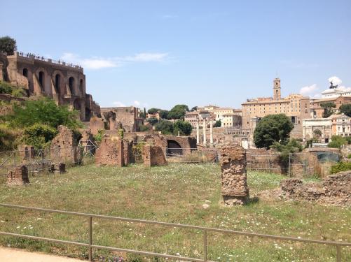 Das Forum Romanum ist eine sehr berühmte Kulturstätte in Rom. Das Forum Romanum liegt unmittelbar neben dem Kolosseum. Auf dem Forum Romanum kann man heute nur noch die Überreste von Tempeln, Basiliken und Triumphbögen sehen. Auf dem Forum Romanum stehen auch ganz alte Olivenbäume. Viele sind über 1000 Jahre alt. Neben dem Forum Romanum liegt der Berg Palatin. Auf dem Palatin standen viele große Häuser und Paläste. Das Wort Palast leitet sich vom Berg Palatin ab. Es macht nicht viel Spaß, Wenn man bei 38° Hitze lange Schlange stehen muss! Deswegen haben wir uns nicht in die lange Schlange des Kolosseums gestellt.